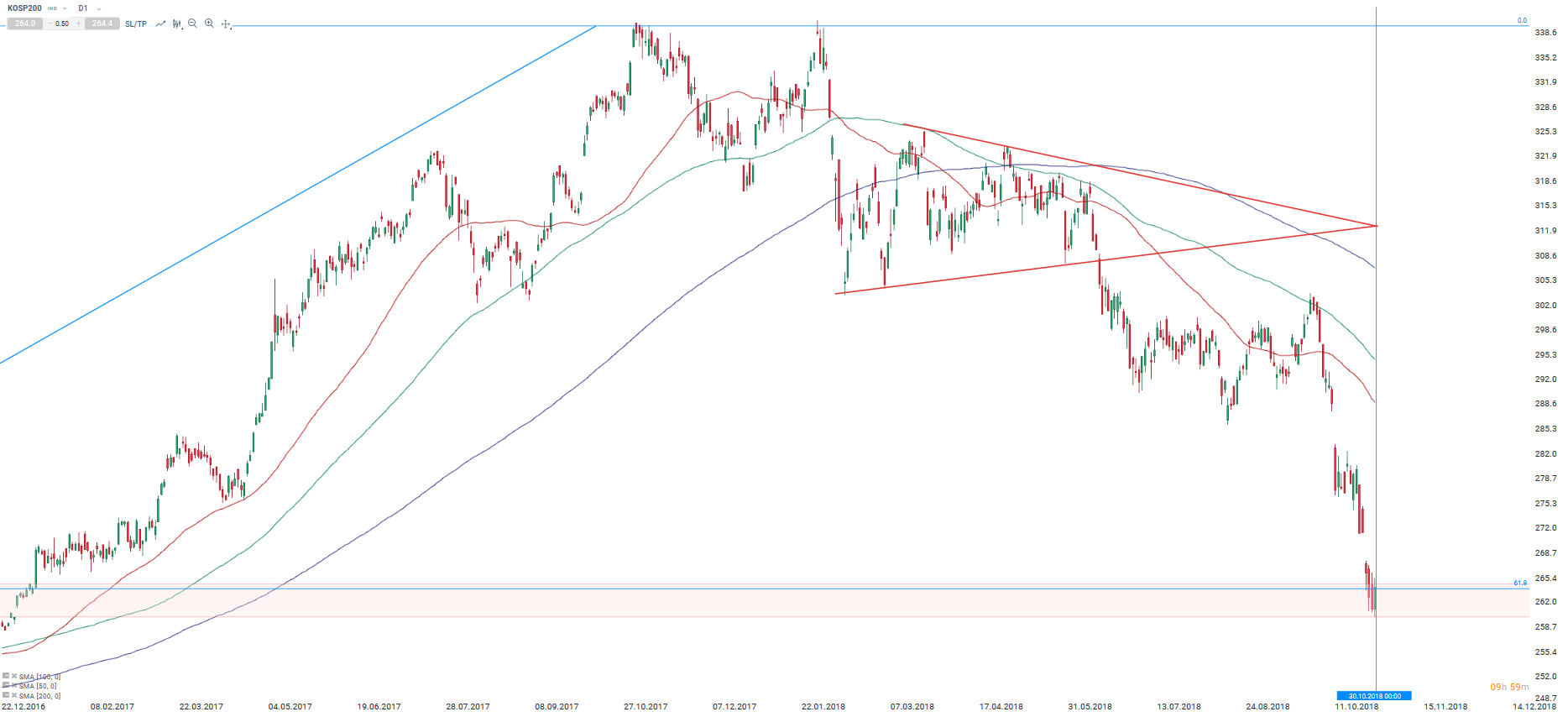 The latest sell-off on the equity markets took its toll all around the globe. Both Asian and US indices experienced severe declines. The bearish momentum eased somewhat recently giving hope that the worst is already over. Korean KOSPI (KOSP200) was one of the most impacted equity indices as it fell all the way down to the 61.8% retracement of the upward impulse started in 2015. It seems that there is a big chance that the index will at least partially recover. Moreover, it is worth to note that arms of the triangle formation the price was moving within in the first half of the year intersected. The moment of intersection is often viewed as the potential end to the breakout from formation.