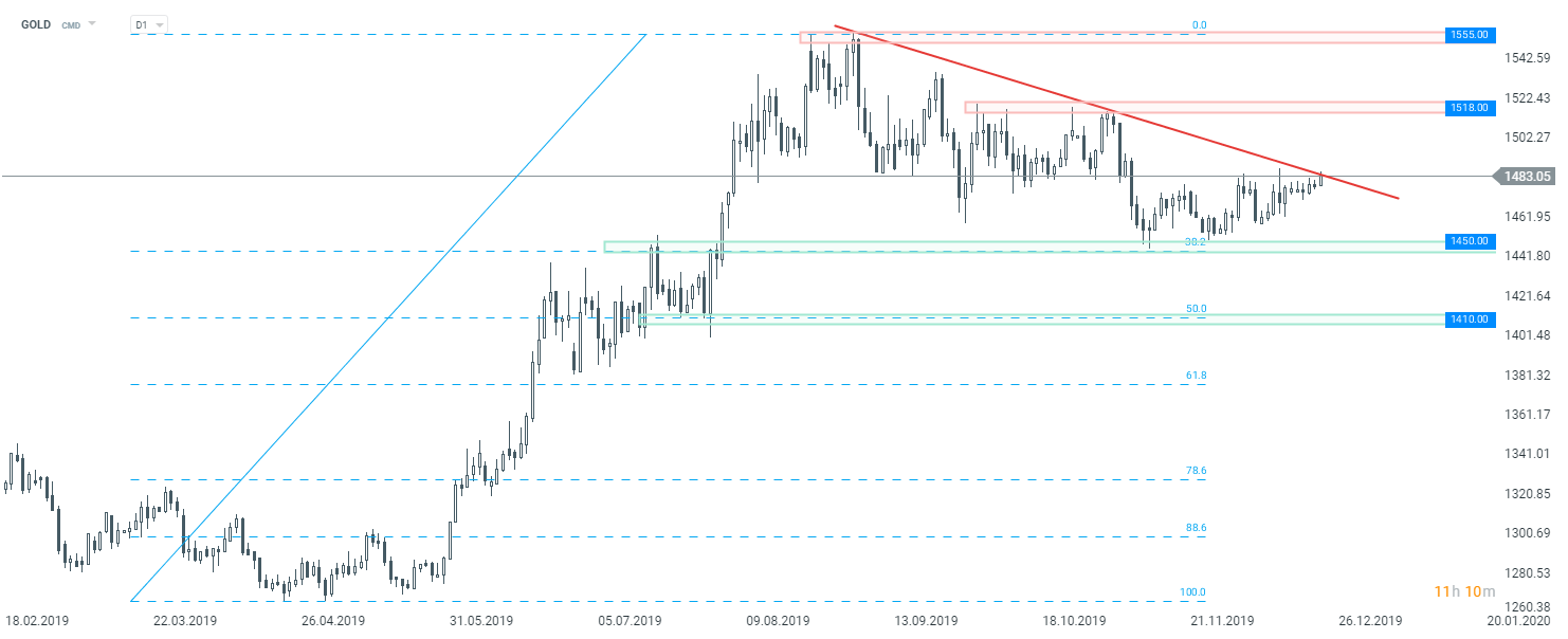 Last but not least, let’s take a look at the gold market. Recent decline was halted at key support area ($1450), which is marked with 38.2% Fibonacci retracement of the upward move started in May 2019 as well as price reaction from the 19th of July. The price is testing the downward sloping trend line. A break higher could trigger a bigger upward impulse that could take the price to as high as $1518 handle. On the other hand a failure to break above the trendline and a potential pullback could take gold price all the way down to $1450.