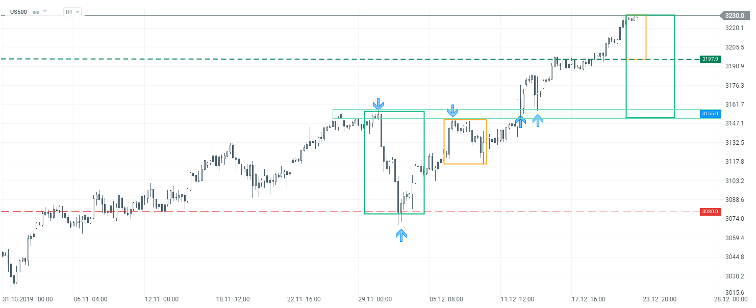 Bullish trend on the US stock market continues. US500 is reaching fresh all time highs each day and today is no different. Should a bearish signal surface, traders could expect a downward correction to occur. In such a scenario, the nearest support can be found at 3197 pts handle, where lies the lower limit of local 1:1 structure. In case the move is not stopped there, the next place to watch is the area around the 3155 pts handle. This level is marked with the lower limit of Overbalance pattern (the biggest correction in the whole upward move started at the beginning of October) andrecent price reactions. Breaking below this hurdle could hint at trend reversal.