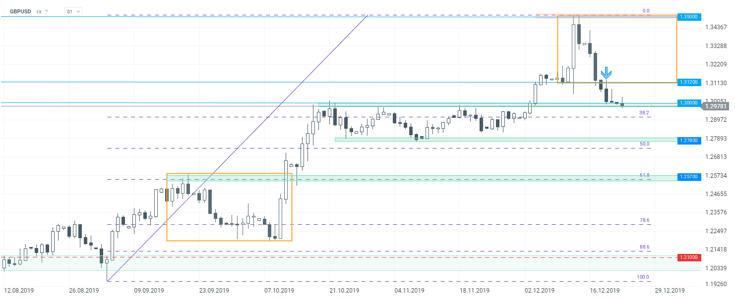 GBPUSD had a turbulent time recently. The market pulled back from the 1.35 handle. The correction we are observing is the biggest one since the beginning of September 2019. According to the Overbalance methodology, the bearish signal surfaced once the price broke below the lower limit of 1:1 structure. Pair is testing the key support at 1.30 handle, where an upper limit of an earlier-broken trading range can be found. Should a bullish signal surface, the pair could make another upward impulse. On the other hand,in case bears continue to pressure the pair, the next support to watch can be found at 1.2780. A break lower could deepen declines to 1.2570.