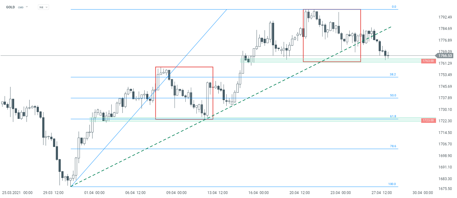 Secondly, let’s take a look at the gold market. Looking at the H4 interval, one can see that a downward correction which was launched last week is being continued. However the price of this commodity reached the key support area at $1,763, marked with the lower limit of 1:1 structure and the previous price reactions. Should buyers manage to halt declines here, another upward impulse may start. On the other hand, breaking below this area will negate the bullish scenario.