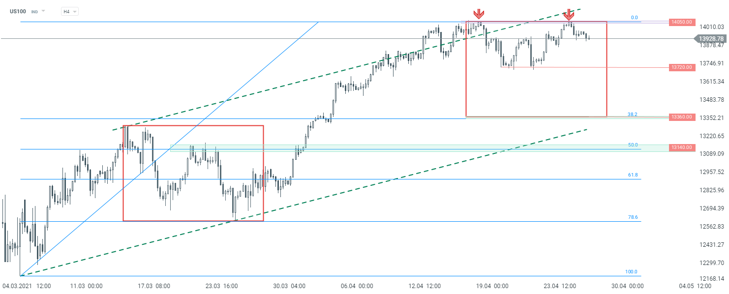 Let’s start today’s analysis with the US tech index - Nasdaq (US100).Looking at the H4 time frame, one can see that the upward move stopped at 14,050 pts and the potential double top pattern is building up. The main trend remains upward, however in case of a break below the 13,720 support, which is also the neckline of the aforementioned formation, the downward correction move may accelerate. Considering the bearish scenario, the next key support is located around 13,300 pts and is marked with the lower limit of 1:1 structure, 38,2% Fibonacci retracement and the previous price reactions. On the other hand if buyers manage to break above the resistance at 14,050 pts, the market may continue to move into uncharted territory.