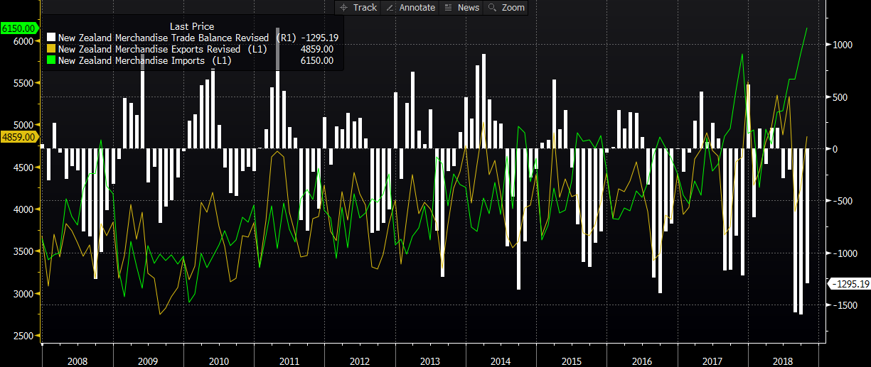 New Zealand’s imports soared in October and reached the highest nominal value ever. A lot could be ascribed to higher crude prices as the New Zealand economy imports this commodity. Source: Bloomberg