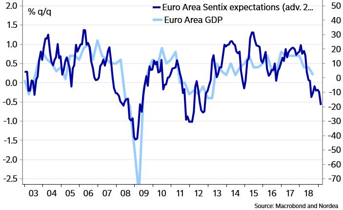 Euro Area sentiment has dropped sharply with economic expectations falling to its lowest level since August 2012. This could be seen to offer an ominous warning sign for GDP going forward. Source: Macrobond and Nordea