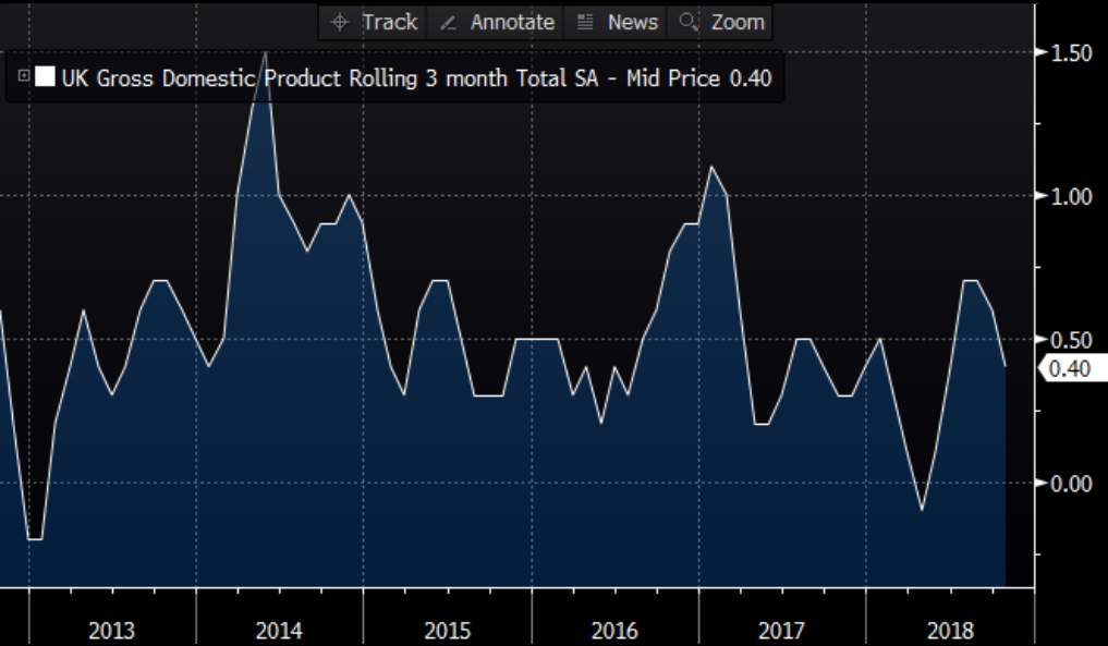 The pace of economic growth in the UK appears to be slowing as the strong increases over the summer start to roll out the data on a 3 month basis and the ongoing Brexit uncertainty becomes a larger headwind. Source: Bloomberg