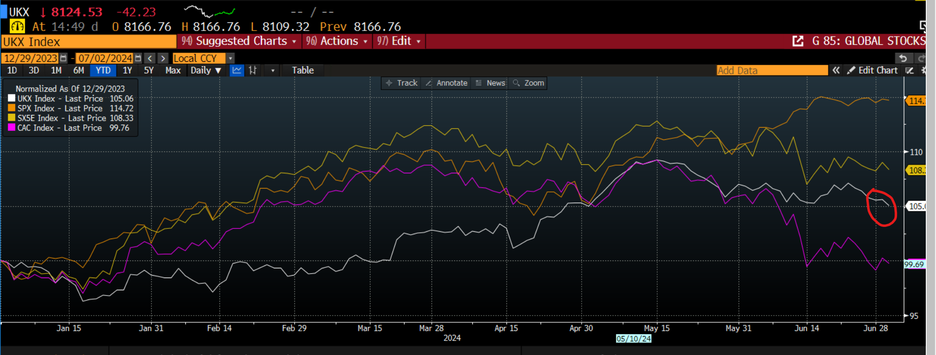 There has not been an overarching theme driving the FTSE 100 in recent weeks. Considering there are fears about when interest rates will be cut along with global election risk, it is not clear if UK stocks are seeing more losers than winners because Labour is expected to win the election. Instead, it looks like the UK is following global trends. There is also a noticeable investor preference for US stocks rather than European stocks, as you can see below, which cannot be blamed on Labour.