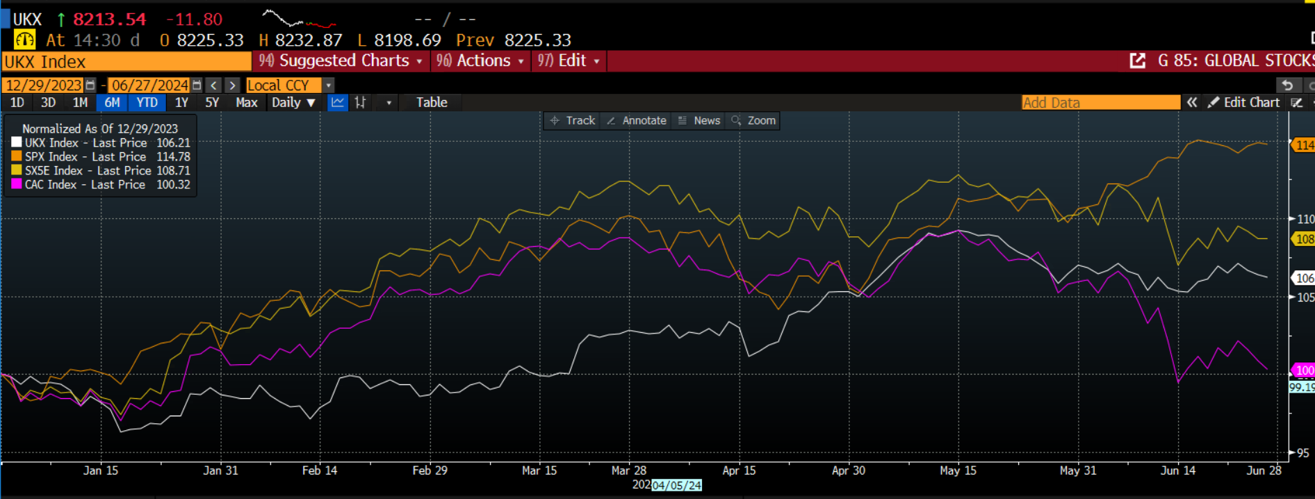 Lastly, stock indices have been mixed in recent weeks and as we move to the second half of the year. The FTSE 100 has underperformed the S&P 500 and the Eurostoxx 50 index, however, it has outperformed the French Cac Index, which has been under intense pressure since the start of the month and is lower by 7% in June. In contrast, the UK’s FTSE 100 index is down by 1% in the past month, which suggests that there is a lower political risk premium in the UK index compared to the French index.