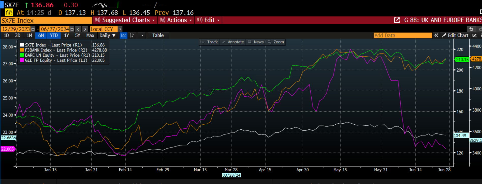 Chart 4: Eurostoxx index and Soc Gen, FTSE 350 banking index and Barclays, normalised to show how they move together.