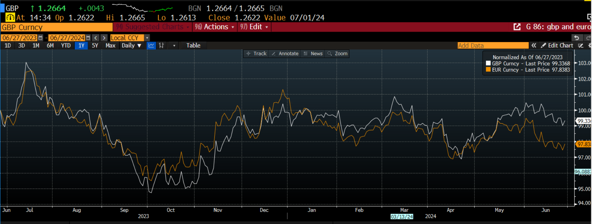 Chart 1: GBP/USD and EUR/USD normalized to see how they move together.