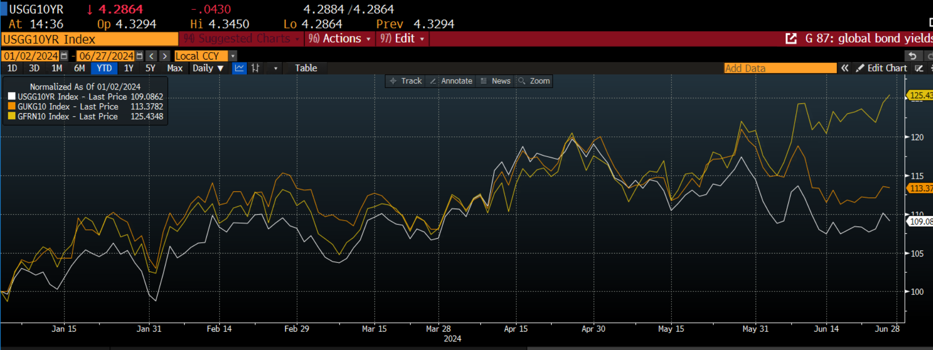 Chart 2: UK, US and French 10-Year sovereign bond yields, normalized to show how they move together.