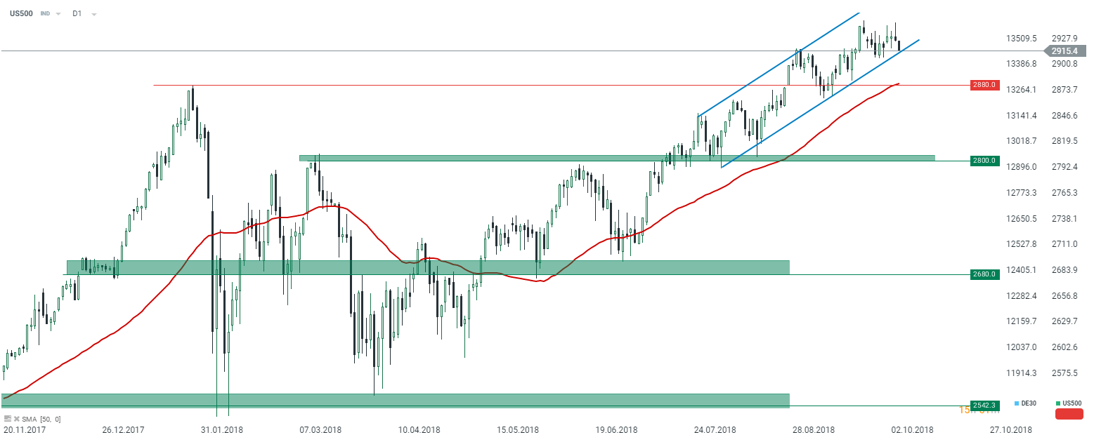 The SP500 (US500) is testing the lower limit of the bullish channel. If bears mange to break through this level, they may push toward 2880 points. Source: xStation5