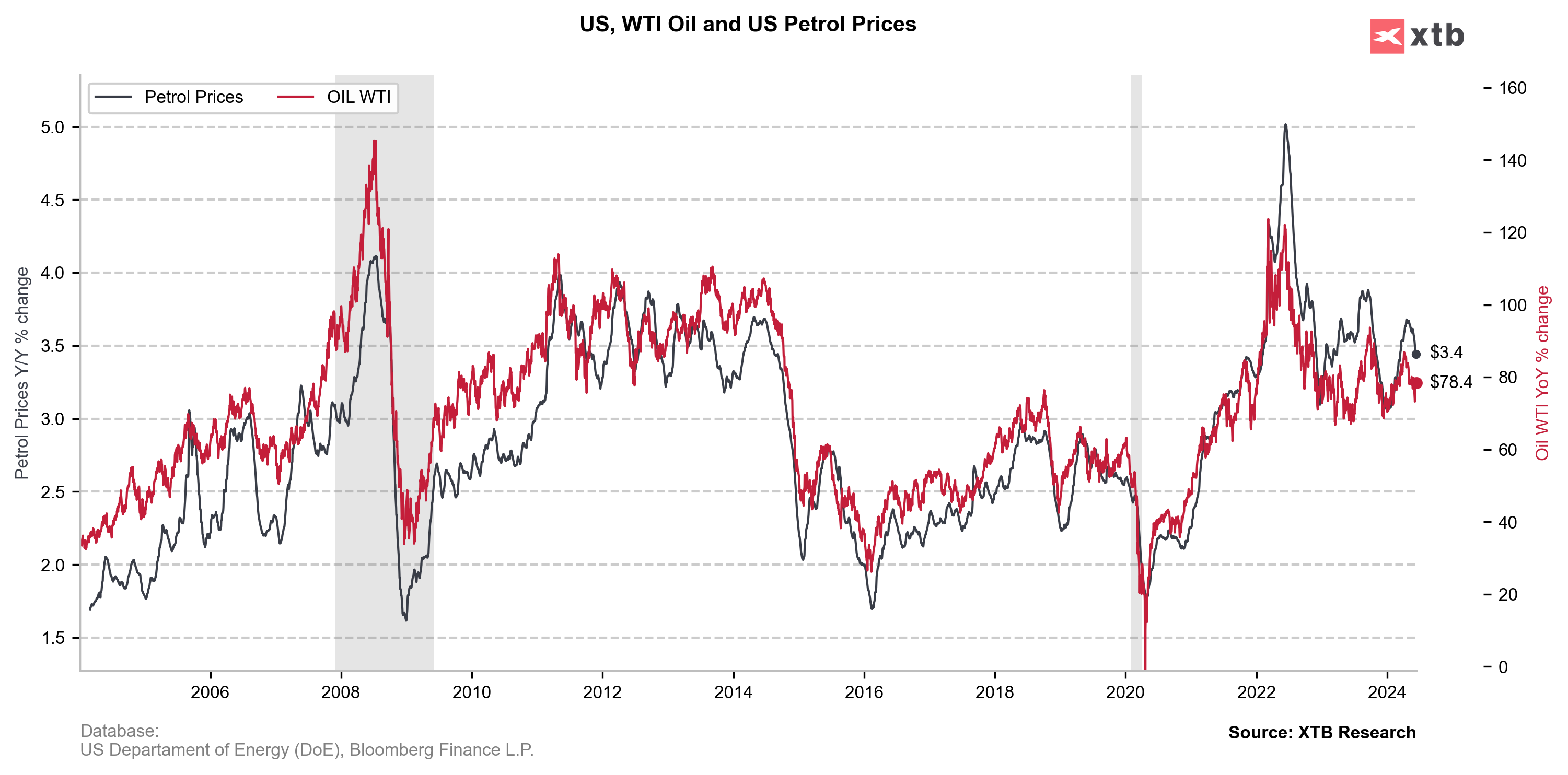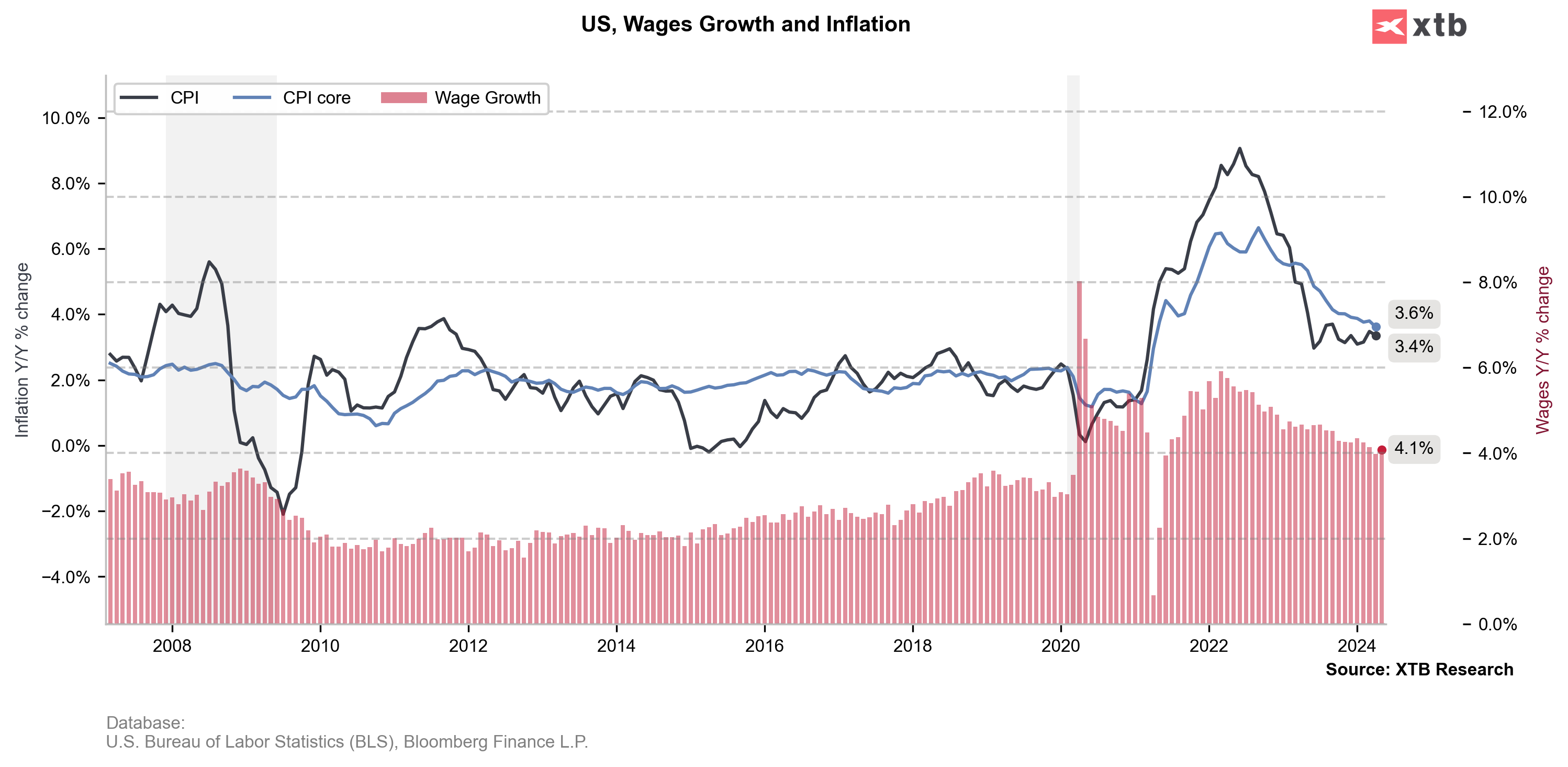 Headline inflation is expected to remain unchanged at 3.4%, but core inflation should fall to 3.5%. Source: Bloomberg Finance LP, XTB