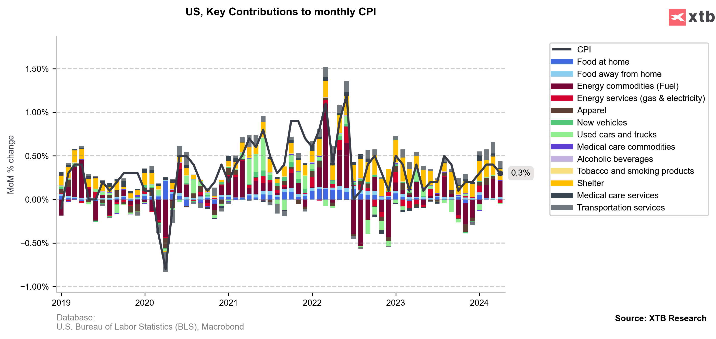 Fuels prices had a positive contribution for April, but this should change to the downside in the May report. The contribution of rental inflation on a monthly basis remains high, although significantly lower than in the first three months of this year. If the next inflation reports come in as expected at 0.1%-0.2% on a monthly basis, as was the case at the end of last year, then the discussion of cuts will begin again during a holidays and the Fed will be ready to cut in September. Source: Macrobond, XTB