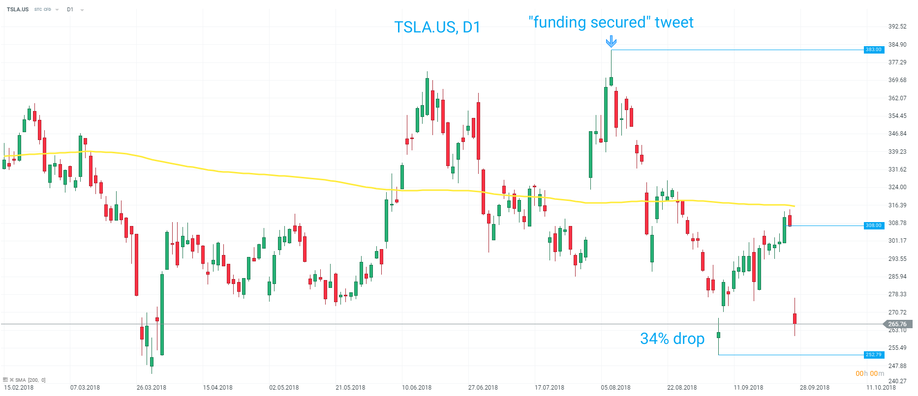 Tesla shares dropped sharply on Friday after news of the SEC charges broke but nearly all the declines are expected to be recouped on the opening bell with the stock surging in the pre-market after Musk settled over the weekend. Source: xStation