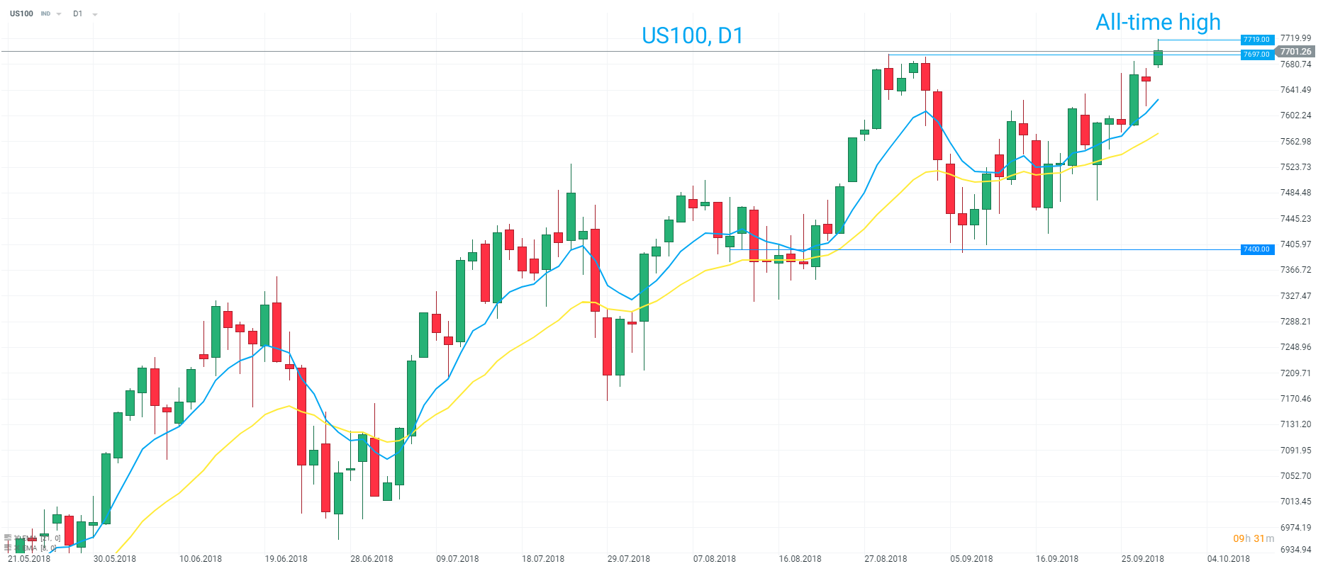 The US100 has made a new record high today with the market gapping higher and moving up above 7700. Source: xStation