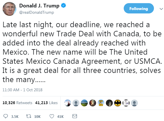 US President Trump trumpeted the new trade agreement on social media, after the US, Mexico and Canada reached a deal just before the deadline. Source: Twitter