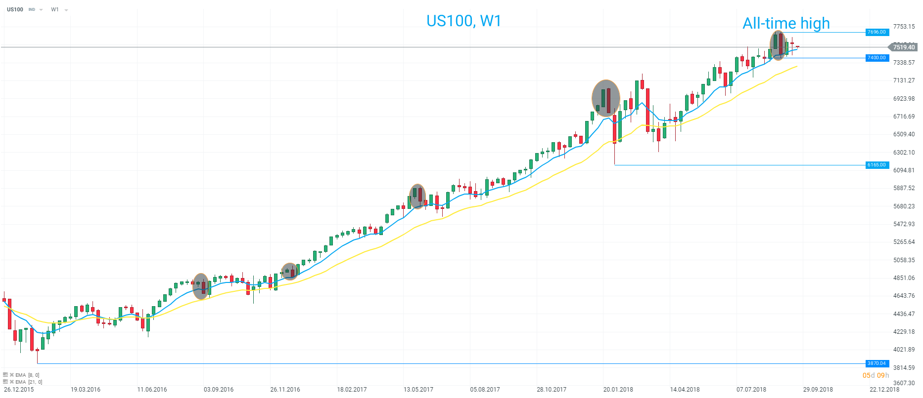 The US100 ended last week little changed with a fairly large doji candle printed. The bearish engulfing candle made a couple weeks back remains in play unless a break above 7696 occurs, but it should be pointed out that prior bearish engulfing candles haven’t always marked turning points lower. Source: xStation