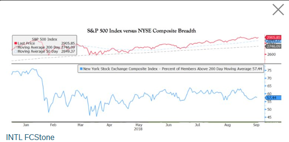 While the S&P500 (US500 on xStation) has continued to rise to record highs the breadth - as measured by the percentage of members above their 200 day SMA - has actually fallen lower. Is this a sign that the latest gains are unsustainable? Source: INTL FCStone
