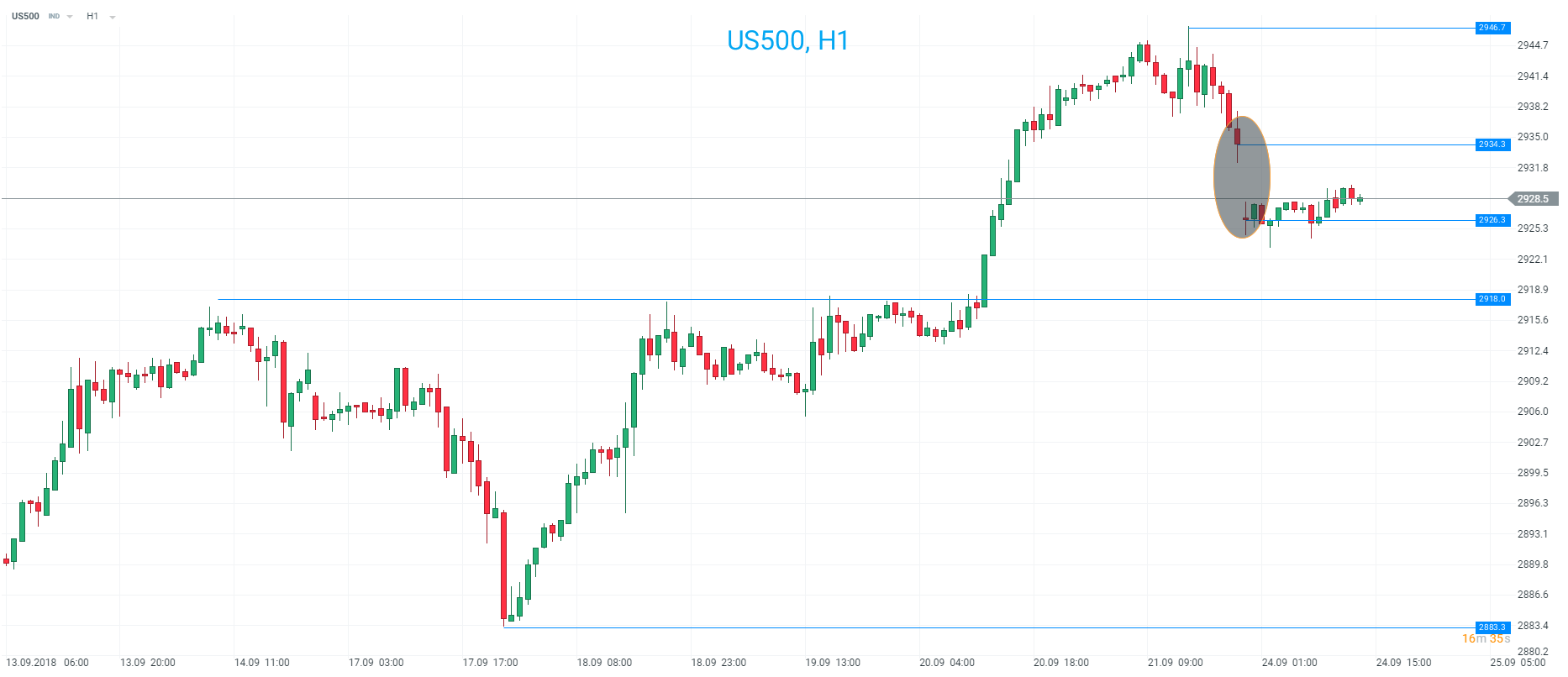 The US500 gapped lower from last week’s closing level of 2934 to reopen around 2926. As long as price remains above the 2918 then the breakout remains valid. Source: xStation