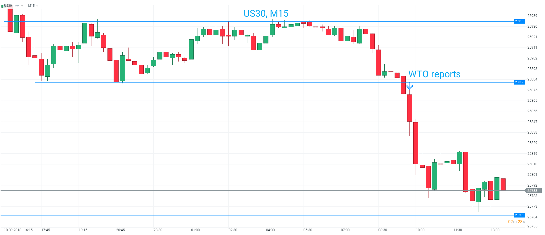 The US30 broke below prior support around 25882 around the time these WTO reports hit the wires and the market then embarked on a descent in excess of 100 points to make a new low for the month at 25766. Source: xStation