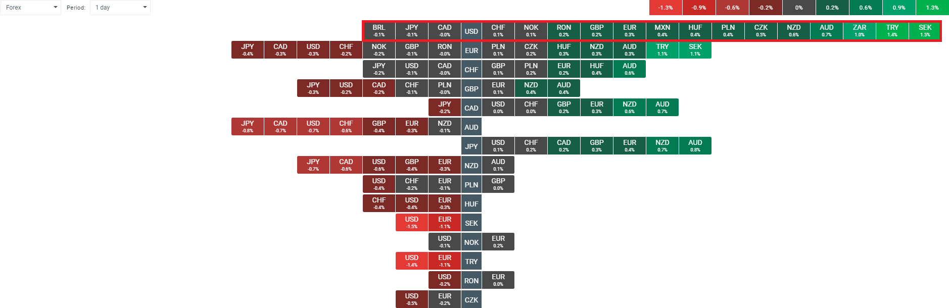 The USD is losing ground today and only higher against a few currencies. The biggest gainers are the SEK, TRY and ZAR. Source: xStation