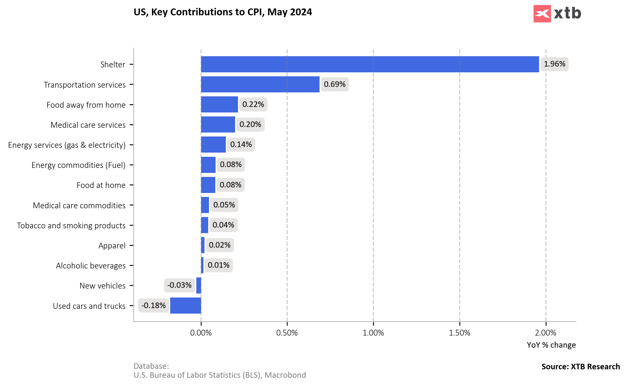 When it comes to year-on-year data, rent inflation continues to contribute the most, though its share is gradually decreasing. However, it's worth noting that without the drop in car prices, we likely wouldn't have seen a decrease in headline inflation to 3.3% and core inflation to 3.4%. Source: Macrobond, XTB