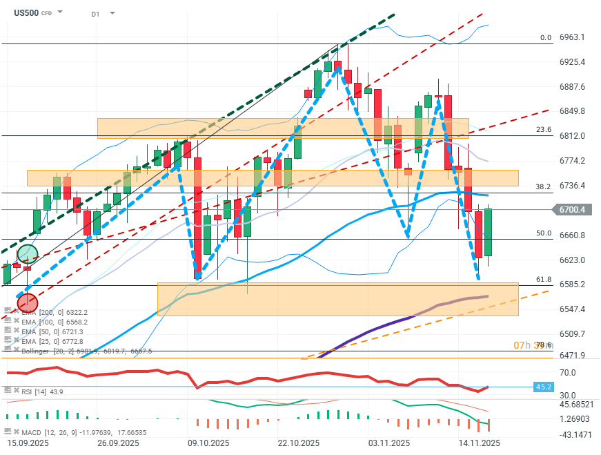 The chart shows a moderately successful attempt to negate the forming head and shoulders pattern, while the candle on the D1 interval performs a bullish engulfing. To completely negate the H&S pattern, buyers must exceed and maintain the FIBO 38.2 retracement level, with resistance at the 6700 level and the EMA50 average. Additionally, RSI (14) in the oversold region (45) will work in favor of buyers. If sellers want to maintain the recent initiative, the price must remain below the FIBO 50 level, allowing for the continuation of the downward movement towards the strong resistance zone at the FIBO 61.8 level, where the long-term trend line and EMA100 average also occur.