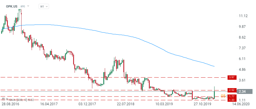 OPKO Health (OPK.US) share price is testing the upper limit of the range at $2.52 per share. If the upside bias continue then the next potential level of resistance is located at $3.97 per share. Source xStation5