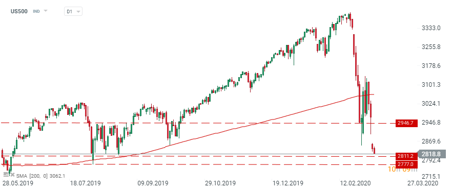 US500 went down today following footsteps of other global equity markets. The index is testing price zone at 2811 pts after opening of today’s cash session. If this level holds then we might expect some stabilization. However if the market makes a move below the 2811 pts swing level then the next support level can be found at 2777 pts. Source: xStation5