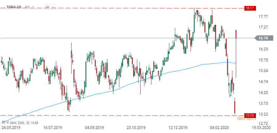 TEGNA (TEGNA.US) - share price is in the middle of the range between $13.18 and $18.17. Any further statements regarding the offer issued by TEGNA’s management may lead to further price movements. Source xStation5