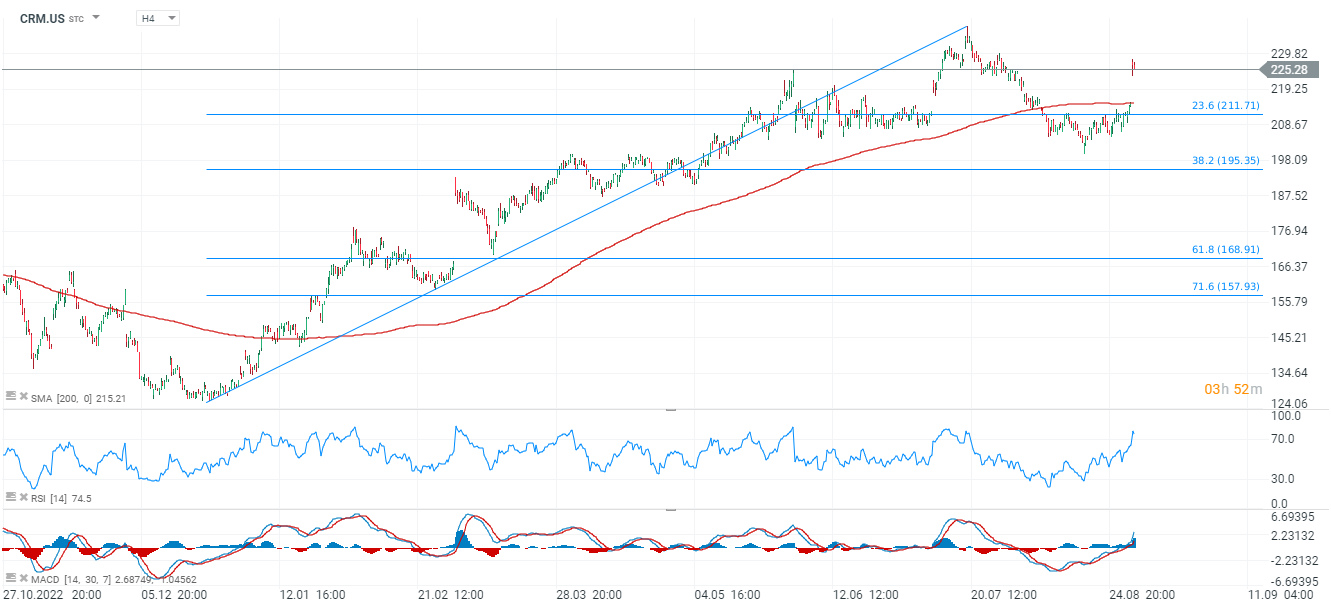 Salesforce (CRM.US) shares, H4 interval. The stock continues its uptrend and has broken through resistance at the SMA200 (red line) with a powerful upward gap. At the same time, the RSI is approaching overbought levels so further profit taking after a strongly upward opening is not excluded. Source: xStation5