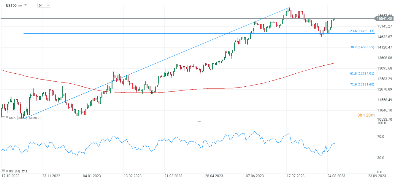 Contracts on the Nasdaq (US100) are gaining 0.12% today, and looking at the D1 interval the index maintains its upward trend. Despite several days of gains, the RSI is just over 50 points and a test of this year's maxima in the next few sessions seems likely. Source: xStation5