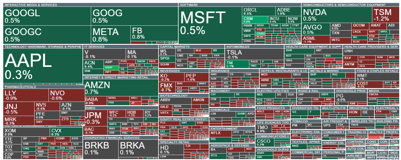 Percentage changes of S&P500 companies. Strong gains for Arista Networks and Salesforce (both companies supported today by anything related to the AI trend) - again, 'BigTech' and the software sector as a whole are doing well. Source: xStation5