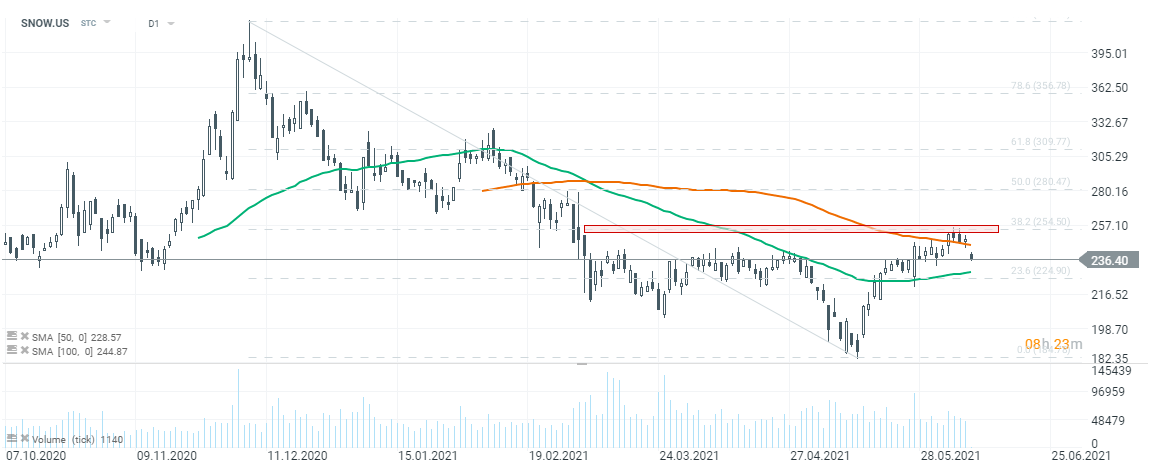 Snowflake (SNOW.US) shares opened lower despite upbeat forecast presented by the firm’s executives. Taking a look at a daily chart, one might notice that the stock launched an upward impulse in mid-May, but the price was unable to break above the 38.2% Fibonacci retracement ($254.50 area) of the downward move started in December. The price returned below the 100-day moving average (orange line). Should the downward move continue, traders may soon focus on the 50-day moving average (green line) and the $225 area (23.6% retracement). Source: xStation5