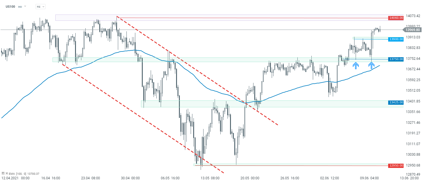 US100 spiked yesterday, jumping above the 13,900 pts mark. Therefore, the path towards all-time highs near 14,060 pts remains open. Reaching these levels is now certainly the goal of many traders around the world. Traders might expect higher volatility after the release of the Michigan data. In case of any declines, the 13,900 pts is the first support to watch. Source: xStation5