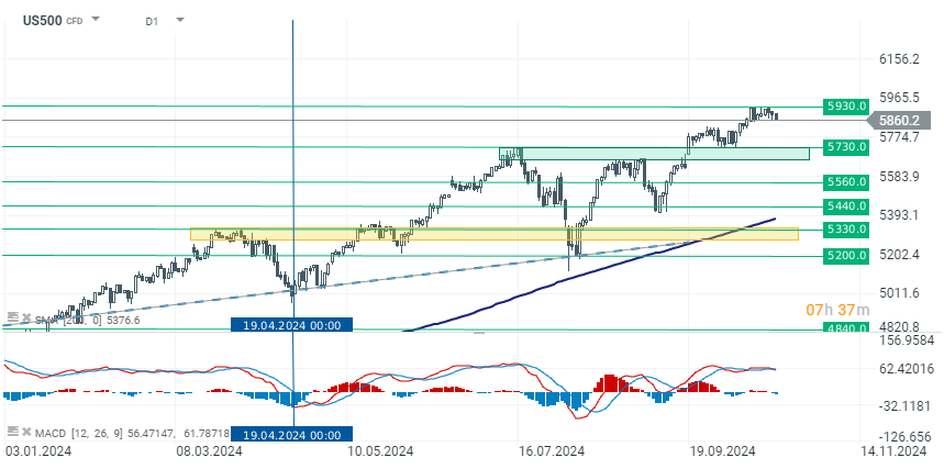 The upward momentum on the US500 index has clearly slowed. A local and historical peak was formed around 5930 points last week. Bulls are currently facing evident difficulties in sustaining demand amidst a particularly strong dollar. The dollar index USDIDX has gained over 4.00% since its low in early October and is gradually putting more pressure on the stock market. However, key catalysts for upward or downward movement could be the earnings reports of the largest companies in the index, which we will learn this week and next. Next week will also bring labor market reports. Lower-than-expected data will certainly increase expectations for interest rate cuts. Conversely, higher data may suggest fewer rate cuts this year, consequently increasing downward pressure on the indices.