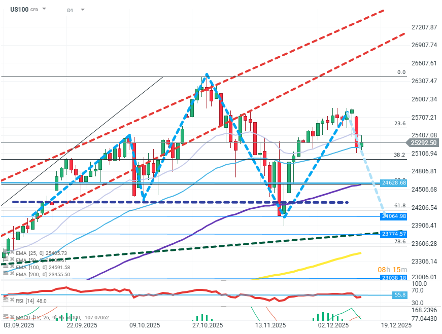 The valuation on the technology index chart continues the realization of the RGR formation. Today's session is yet another attempt to negate the formation. The key level for buyers is 26000 and FIBO 23.6. These levels must be exceeded to negate the formation. At the same time, sellers must bring the price at least around the neckline level of approximately 24200 to have hope for the realization of the formation.