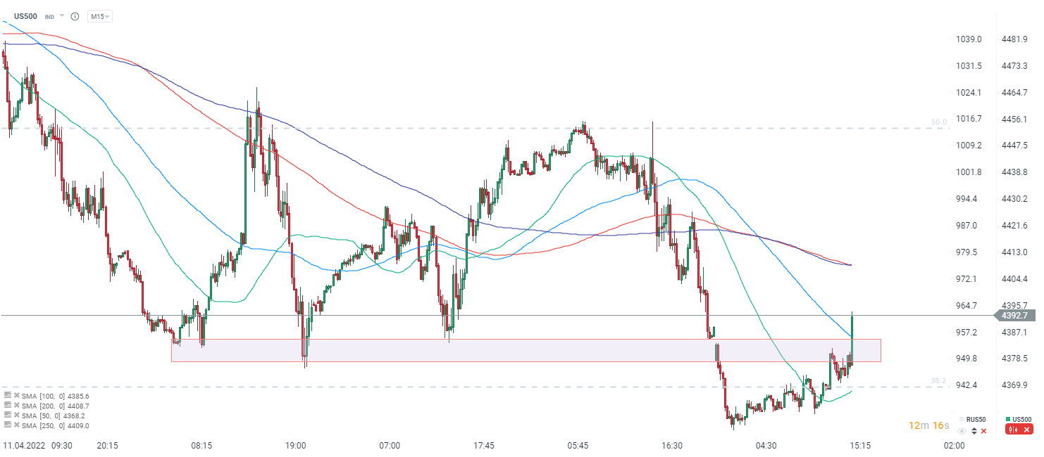US500 lost heavily on Thursday, just before the Easter break. However, the market is defending against going below the 38.2 retracement. A return above 4400 points could stop the negative sentiment. At the same time, we see that the strong demand zone was previously broken through but investors managed to get back the index above the mentioned zone.Source: xStation5