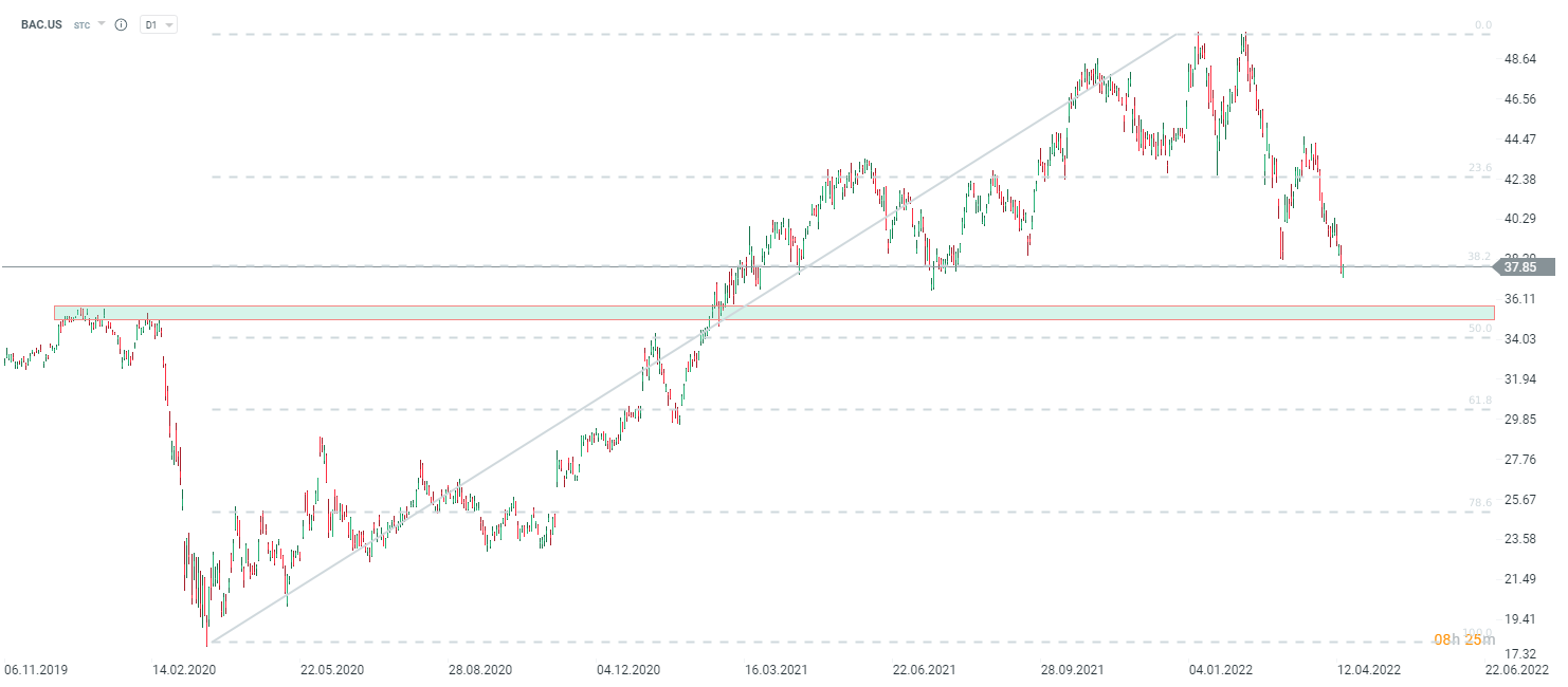 Bank of America shares fell to $37.5, below the 38.2 retracement of the huge rebound after the initial pandemic-related sell-off. A close above $38.5 is key for bulls. However, if declines return, a key support zone is tied to the $35.5 level. Source: xStation5