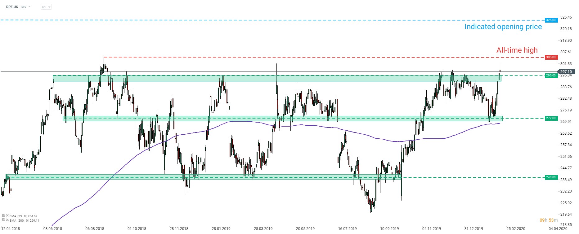 Domino’s Pizza (DPZ.US) has been trading sideways since mid-2018. However, the stock managed to break above key resistance zone at $295 earlier this week and tested $300 handle yesterday. The stock is expected to launch today’s at new ATH near $325 handle - over 10% higher than yesterday’s close. Source: xStation5