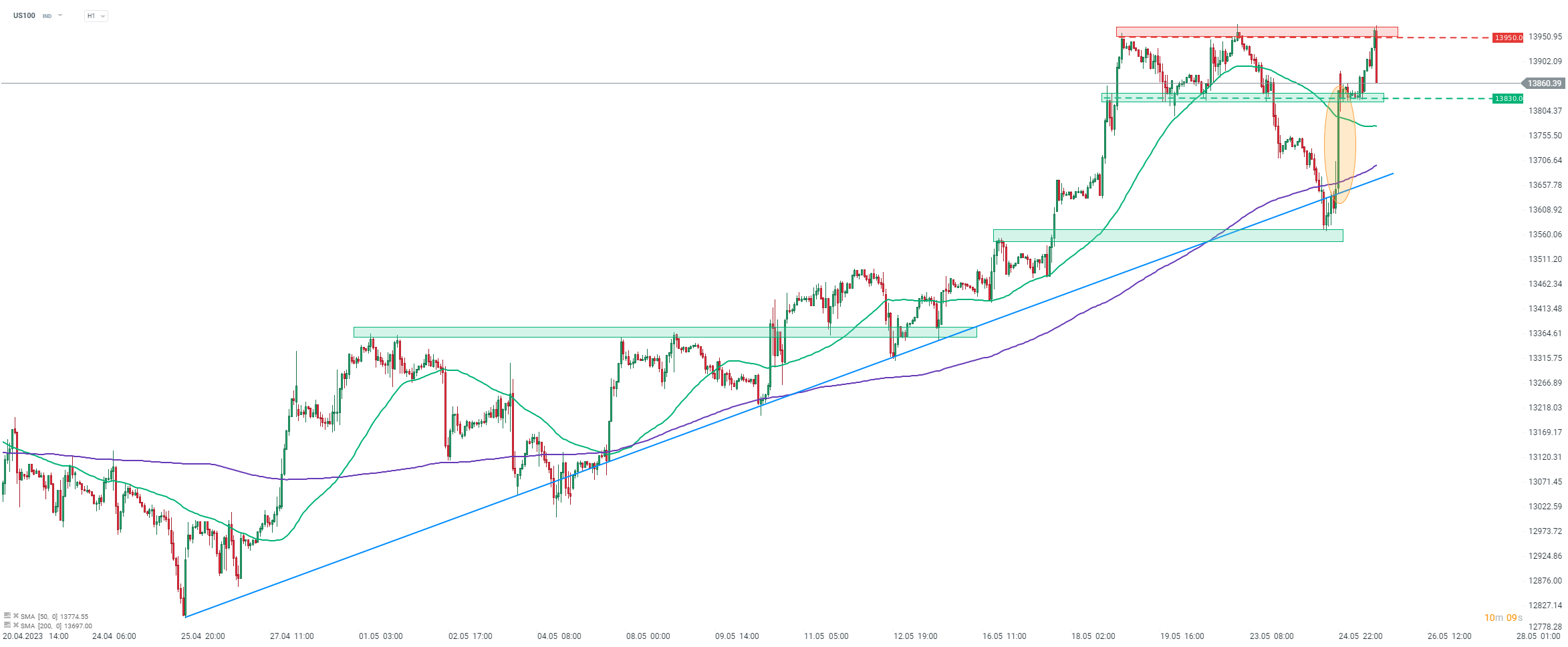 US100 rallied yesterday in the evening following release of Nvidia earnings (orange circle on the chart above). Index has fully recovered from losses suffered on Tuesday and Wednesday, and has once again tested the resistance zone marked with recent local highs in the 13,950 pts area. However, bulls have once again failed to break above and the index started to erase gains after launch of Wall Street cash session today. Should a pullback continue, 13,830 pts support zone will be on watch. A failure to break below could hint at a period of range trading in the 13,830-13,950 pts area until another catalyst for major move surfaces.