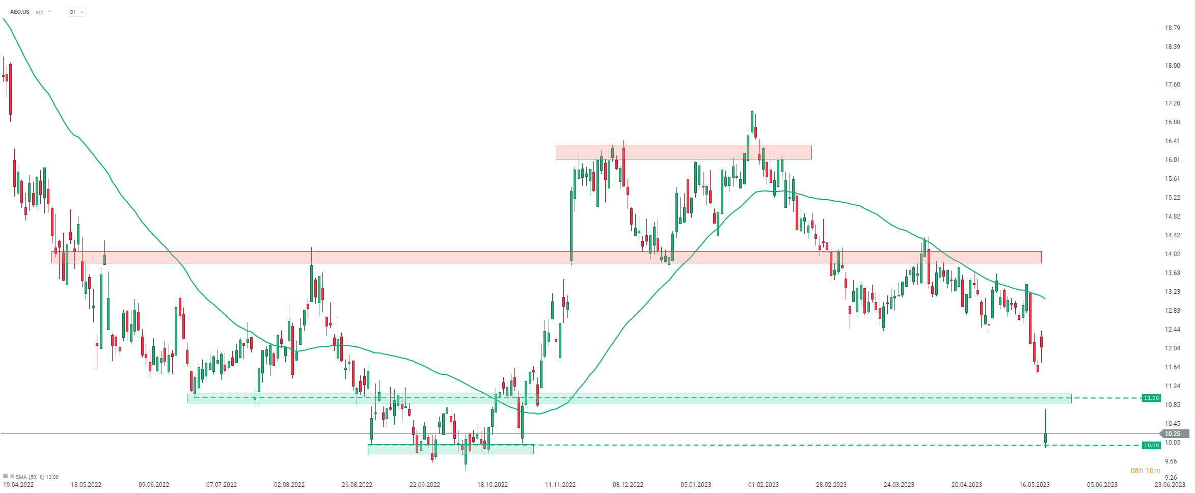 American Eagle Outfitters (AEO.US) launched today's trading with a big bearish price gap. However, buyers found support in the $10.00 per share area and stock started to recover. An important price zone to watch can be found in the $11.00 area. Source: xStation5