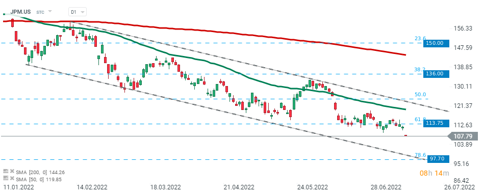 JPMorgan Chase (JPM.US) stock recently bounced off major resistance at $113.75, which coincides with 61.8% Fibonacci retracement of the upward move started in March 2020. As long as price sits below, downward impulse may accelerate towards support at $97.70 which is marked with lower limit of the descending channel and 78.6% Fibonacci retracement. Source: xStation5