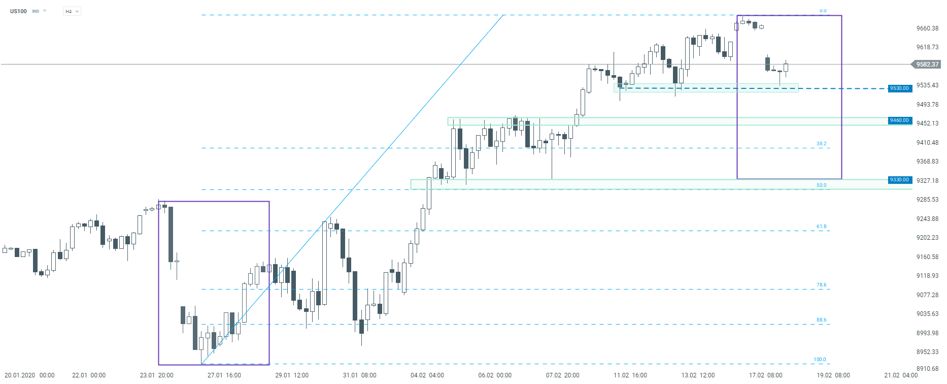 Nasdaq (US100) is trading lower today and may remain under pressure due to Apple’s warning and its consequences on other sectors, like for example semiconductor manufacturers. The index tested the price zone at 9530 pts earlier today. In case the ongoing rebound fails to sustain momentum, this level will be a support to watch. However, it should be noted that after two previous tests of this zone, the index rallied to new ATH. Source: xStation5