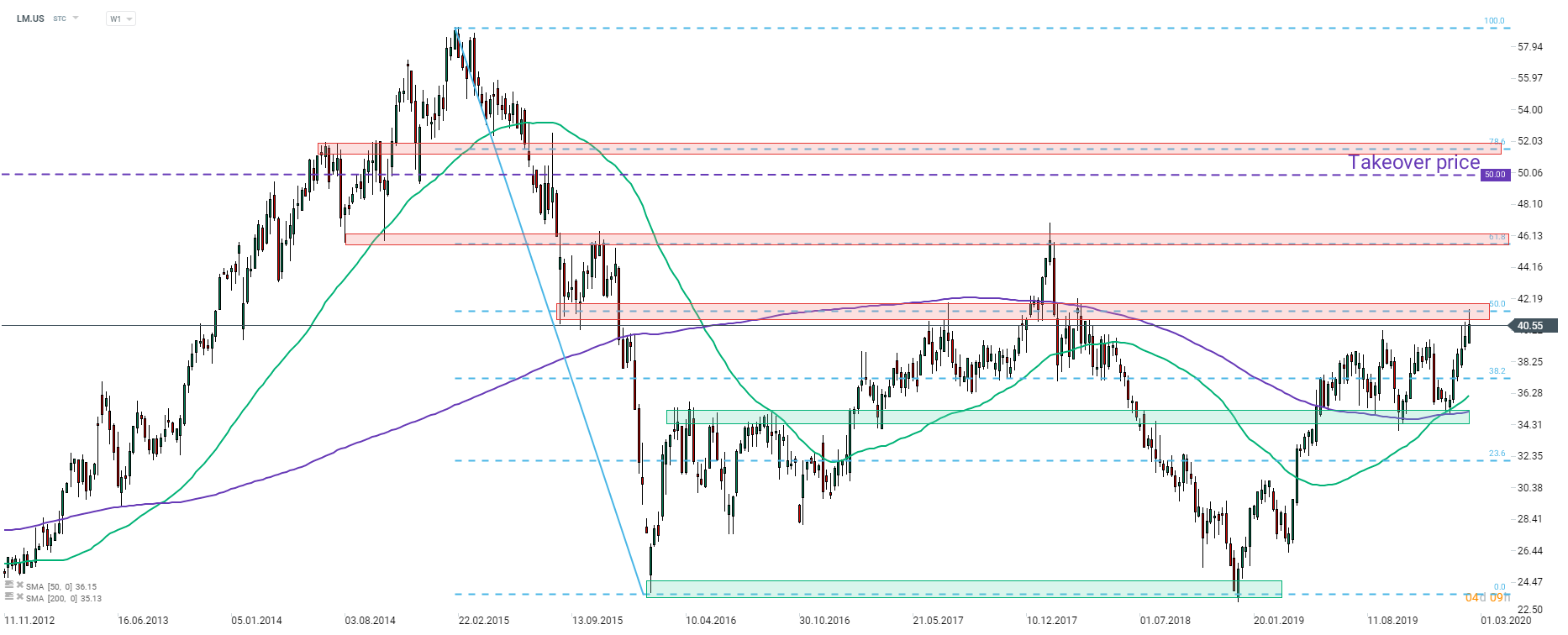 Legg Mason (LM.US) tested the resistance zone at 50% Fibo level at the end of the previous week. However, the company is set to be acquired by Franklin Resources at $50/share. Having said that, the price zone at 78.6% Fibo ($51.50) could be in play today. Should the stock move below takeover price, the nearest support can be found at 61.8% Fibo level ($46). Source: xStation5