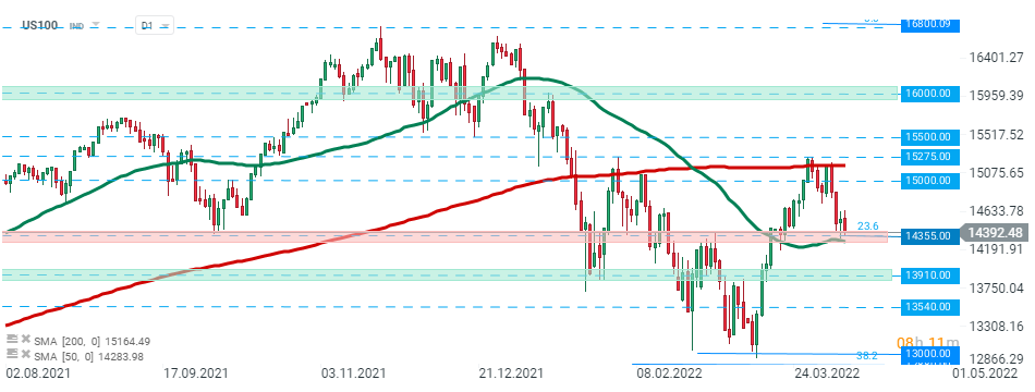 US100 fell sharply in recent days however sellers struggle to break below major support around 14355 pts which is marked with 23.6% Fibonacci retracement of the upward wave launched in March 2020 and previous price reactions. If they succeed, sell-off may accelerate towards next support at 13910 pts which is marked with previous price reactions. On the other hand, if buyers become more active, then the nearest resistance to watch lies at 15000 pts. Source: xStation5