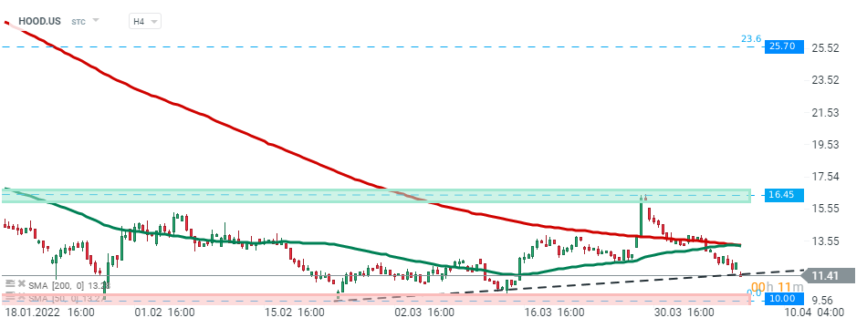 Robinhood (HOOD.US) stock rose sharply at the end of March following news that company plans to expand trading hours, however sellers regained control at $16.45 resistance and price resumed downward move. Stock launched today's session with a bearish price gap and is currently testing local upward trendline. Should break lower occur, major support at $10.00 may be at risk. Source: xStation5