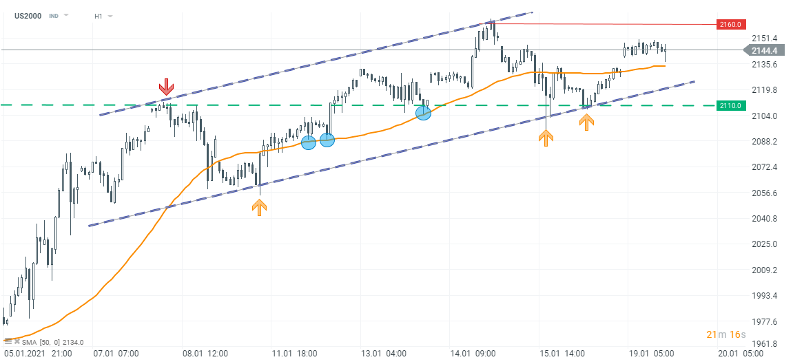 US2000 has pushed higher after the index bounced off the lower limit of a local upward channel. Recent all-time highs at 2,160 pts might be seen as the nearest resistance level. In theory, Yellen words could be viewed as positive for small caps, therefore US2000 is rallying the most among major US indices. On the other hand, the 50-hour moving average might serve as the nearest support level (note previous price reactions on the chart above). The area at 2,110 pts is another crucial barrier right now. Source: xStation5
