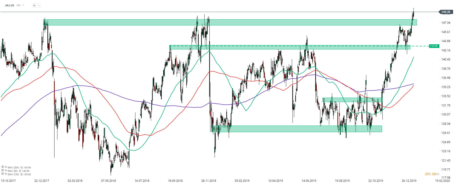 Johnson & Johnson (JNJ.US) made a break above the ATH earlier this week. However, the company is set to open 1.2% lower today following the release of Q4 earnings report. Stock should open within the zone marked by previous record peaks and it cannot be ruled out that recent break was a false signal. Should it be so, the first support to watch can be found at the zone ranging around $143.00 handle. Source: xStation5