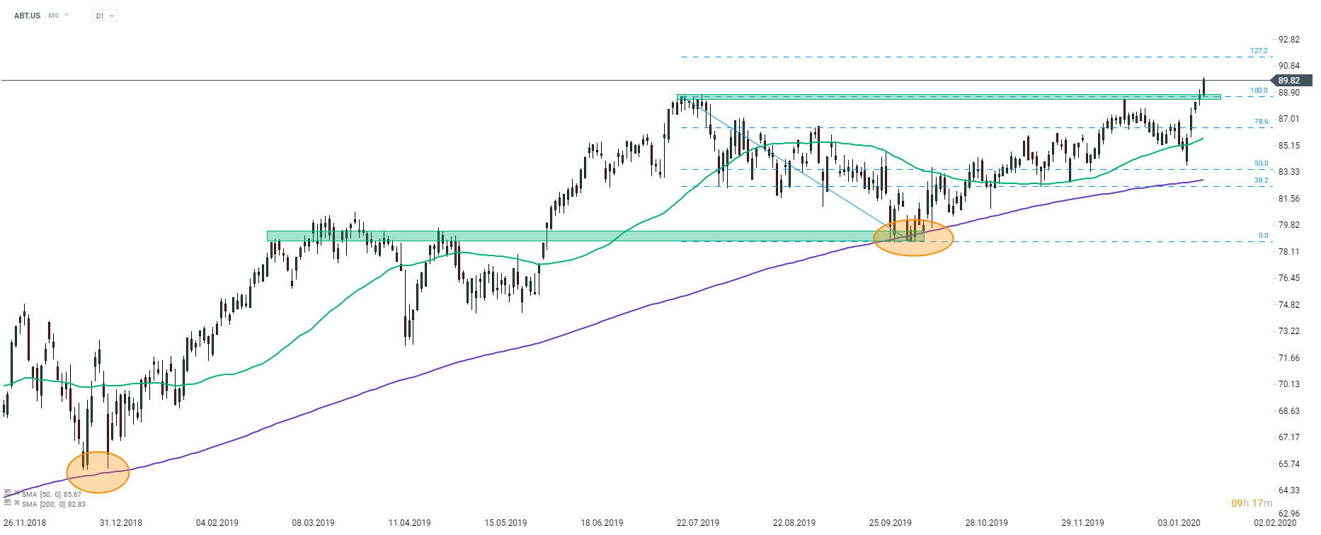 Abbott Laboratories (ABT.US) also broke to a fresh all-time high earlier this week. Company reported results that were in line with estimates therefore no major price reaction is expected at the open. Currently, stock is indicated to open 1.25% higher. The first near-term resistance to watch can be found at the 127.2% retracement of a downward move started in mid-2019 ($91.50). Source: xStation5